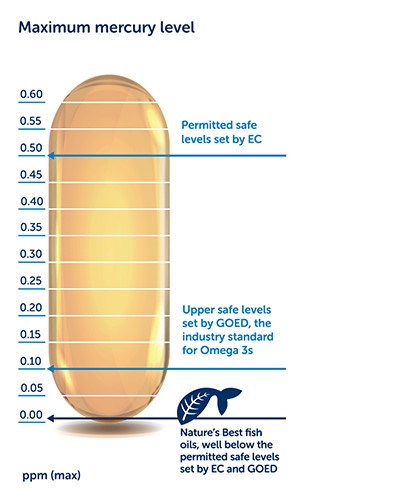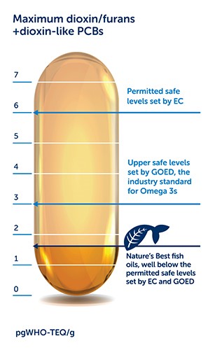 Sadly, our oceans are becoming more and more polluted and like any natural ingredient, fish are just as prone to contamination. We’re proud to report that our fish oil supplements are amongst the purest available. We use the greatest vigilance and a process of routine chemical analysis to ensure that contaminants such as PCBs, dioxins and mercury (present in fresh fish), are well below the permitted safe levels set by the European Commission (EC). In fact, as the graphs on these 2 pages illustrate, our oils go far beyond the requirements of the EC and well beyond the industry measures set by the Global Organisation for EPA and DHA Omega 3s (GOED). GOED standards incorporate the strictest quality and purity standards.