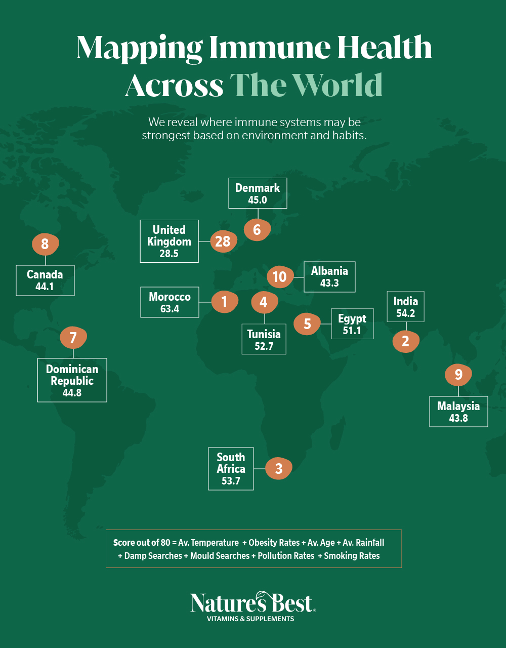 Our results show that Morocco was the top country where immunity strength is tied most positively to environmental and lifestyle factors, with a score of 63.4 out of a possible 80.