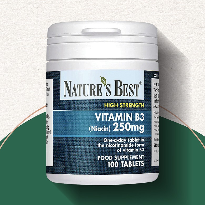 Our high-strength niacin tablets deliver a full 250mg of vitamin B3, a level that would otherwise be difficult to obtain from your diet alone. Given its strength, we recommend taking our niacin tablets for relatively short periods of up to 4 months – not because of safety concerns, but because the body is unlikely to need this level for an extended period. We’ve also included generous amounts of vitamin B3 in our B50 Complex and B100 Complex should you wish to take those instead.